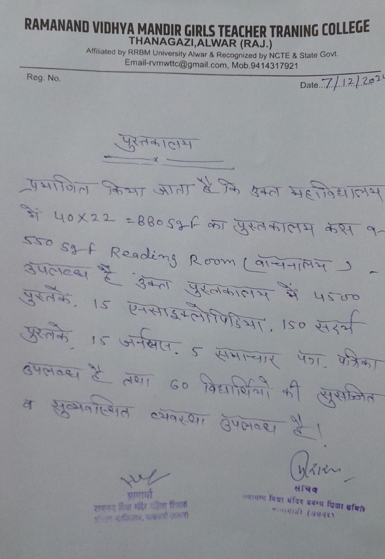Ramanand Vidhya Mandir Girls Teacher Training College is affiliated to the Raj Rishi Bhartrihari Matsya University Alwar. The campus provides healthy and natural environment and consists of large airy, well furnished class rooms provided with comfortable desks, spacious conference/ seminar halls laboratories, staff room and students rest room. A team of dedicated faculty members having vast academic, research experience are the backbone of the institution. It is one of the finest educational institutes of Rajasthan. The primary aim of the college is to create an excellent environment synthesizing the Indian cultural values with the highest quality of teaching and training using modern tools. Our endeavour is not just to import education in the literal sense, but to inculcate character and moral values in the pupil teacher and send back a multi faceted personality to the society so that they can face myriad challenges of life and make a dynamism and versatility teacher. The college gives dual importance to theory and practical studies and other personality development programmes which enables the learners to apply their knowledge in a cross cultural and diverse society.... read more...